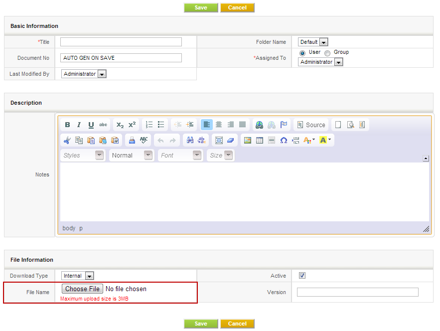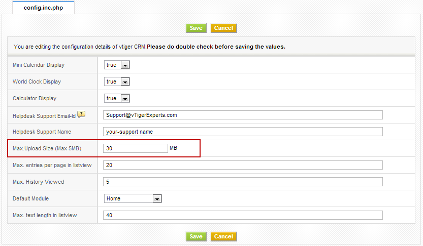 Out of the box vTiger has a limit of 3MB for the file upload when creating and uploading an external document to vTiger. In order to increase the file limit, you have to set it in vTiger Configuration Editor as well as in you servers’ php.ini file.